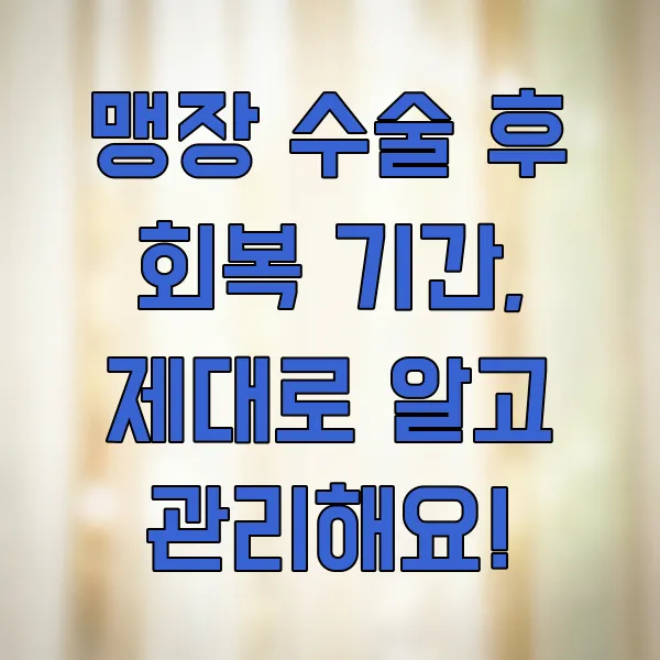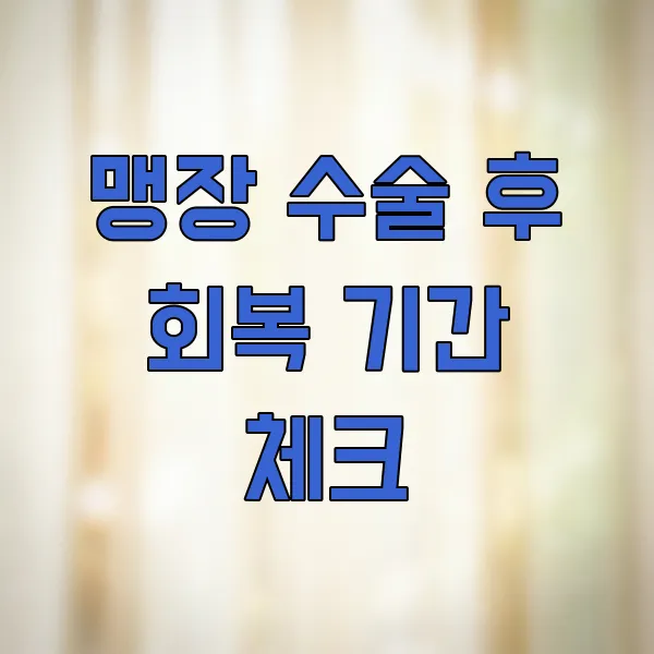 면책 조항: 이 글은 맹장 수술 후 회복에 대한 일반적인 정보를 제공하며, 개인의 건강 상태나 수술 경과에 따라 실제 회복 기간 및 과정은 달라질 수 있습니다. 제공된 정보는 의학적 진단이나 치료를 대체할 수 없으며, 특정 증상이나 궁금한 점에 대해서는 반드시 의료 전문가와 상담하시기 바랍니다.